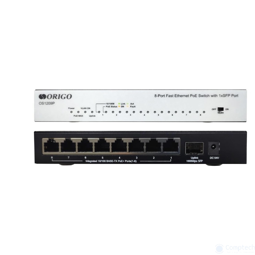 Неуправляемый POE-коммутатор 09 портов Origo OS1209P ( 8x100Мбит/ с, 1xSFP, 8xPOE, PoE‑бюджет 80 Вт) корпус - металл