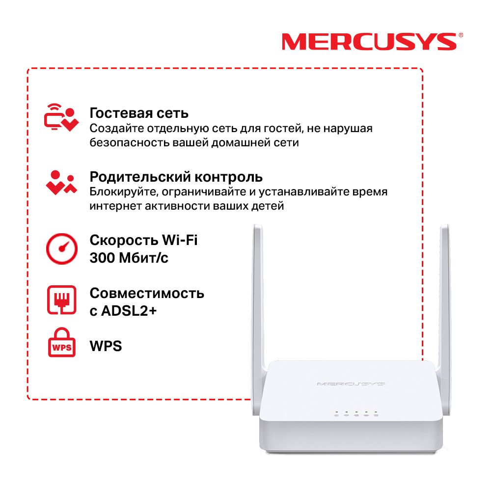 ADSL Модем: MERCUSYS MW300D (2.4 ГГц;2,4 ГГц 300 Мбит/ с; 3х10/ 100 Мбит/ с RJ-11 )