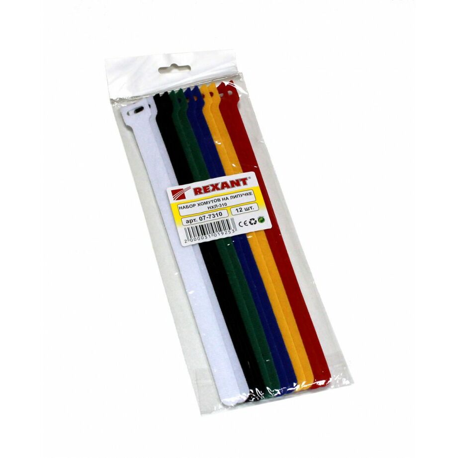 Набор хомутов многоразовых на липучке 310х16мм, цветные (12 шт/ уп) Rexant (07-7310) кратность заказа 10 уп.